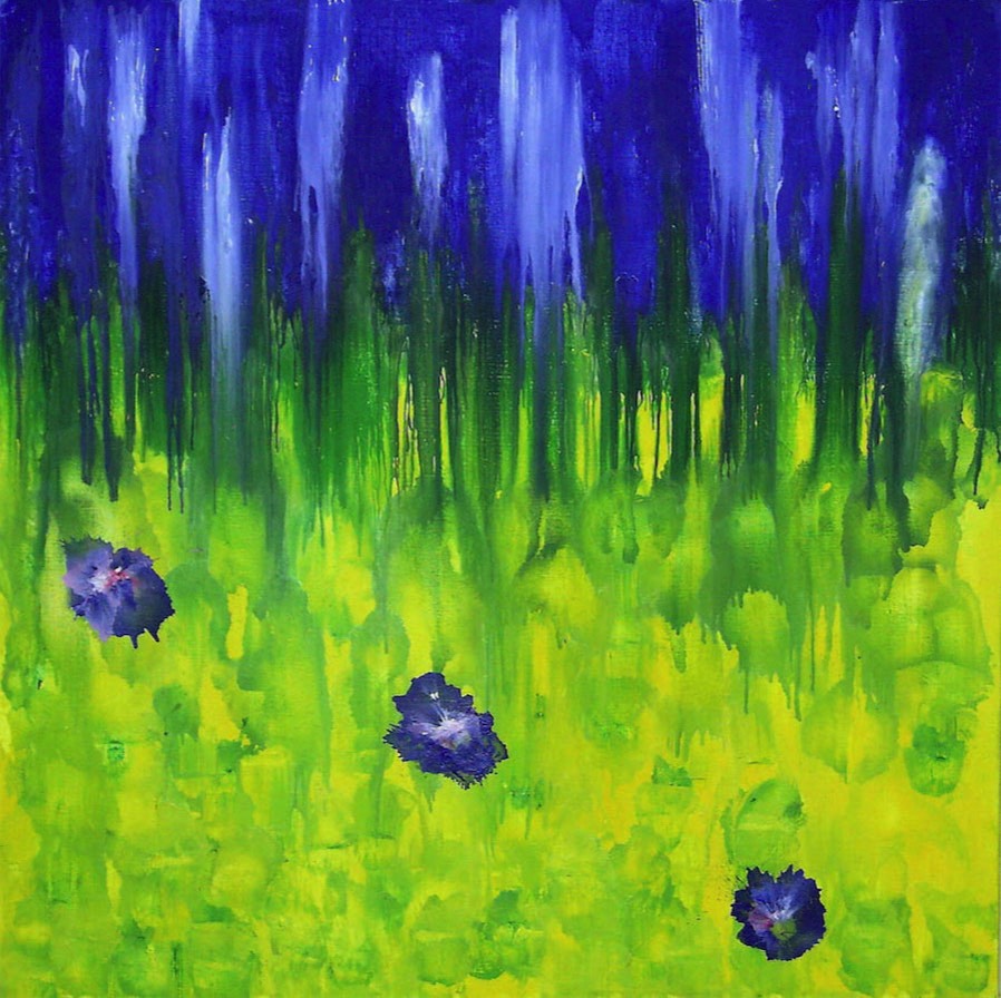 Drei Blumen im Rapsfeld, 110 x 110 cm, Öl auf Leinwand